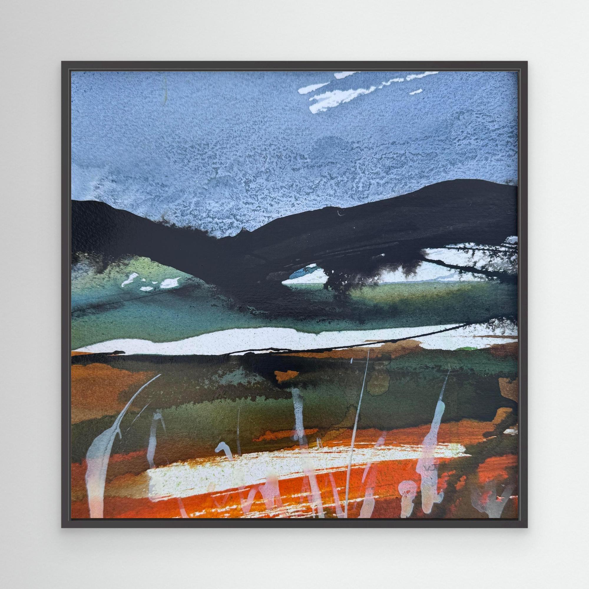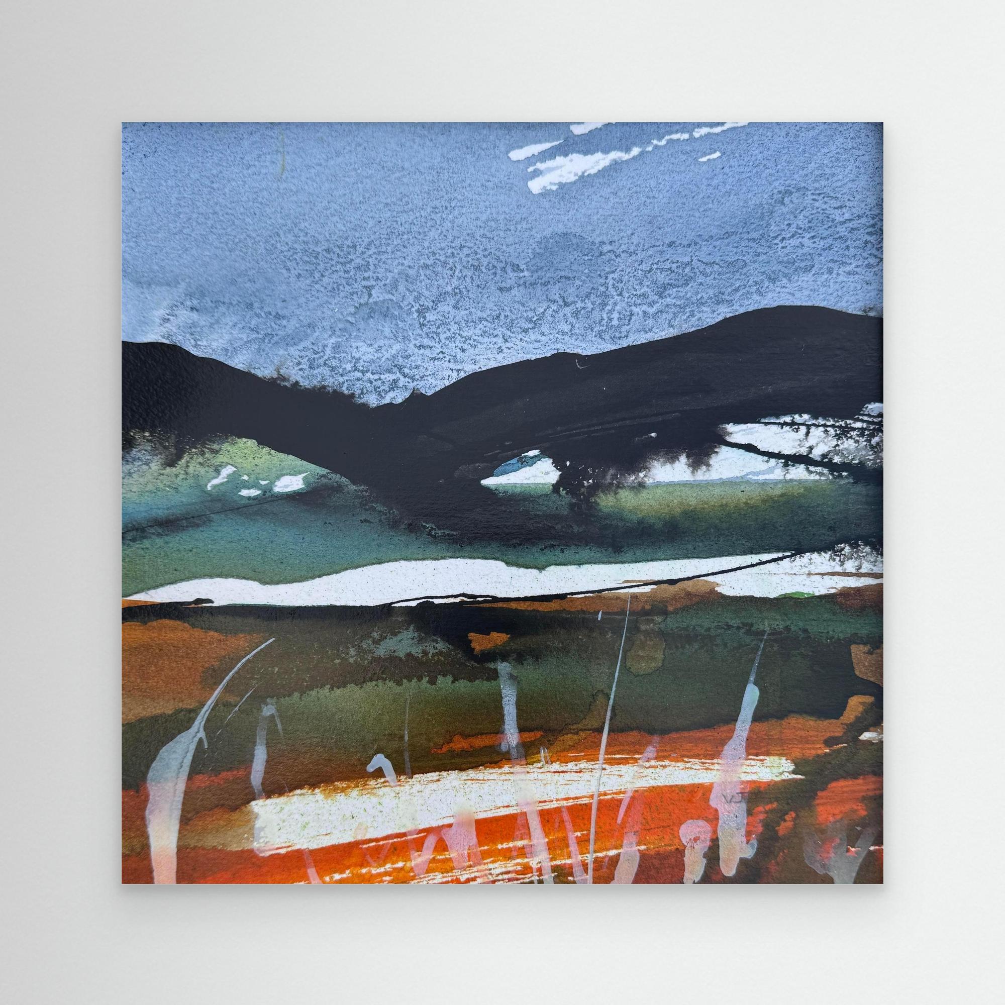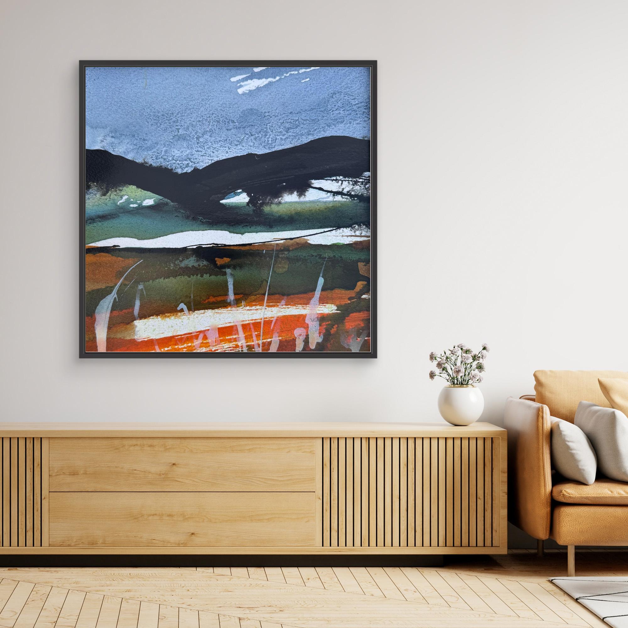 I painted this moody abstract scene in deep blues and warm earth tones, where soft washes meet bold, dark shapes to suggest distant ridges and low light. Layers of pigment and textured marks reveal a spontaneous energy—like a horizon held between dusk and dawn. The composition is calm yet dynamic, offering a thoughtful, grounded presence for a room. A subtle, contemplative piece that feels right at home in living areas, offices, or entryways.